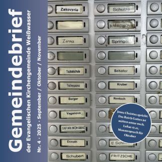 Der neue Gemeindebrief Nr. 2/2025 für die Monate März, April und Mai ist erschienen - wie immer mit vielen Informationen und Lesenswertem, mit Rückblicken und Terminen aus unserer Gemeinde. Wenn Sie den Gemeindebrief auch gerne per E-Mail erhalten möchten, schreiben Sie eine kurze Nachricht an info@ev-kirche-wsw.de .