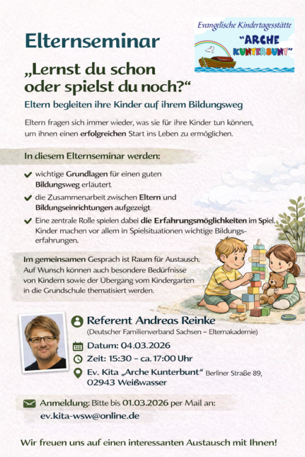 4.3.2026, 15.30 Uhr, Evangelische Kita "Arche Kunterbunt", Berliner Str. 89