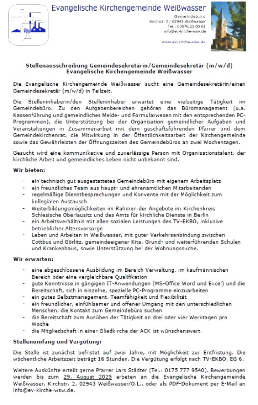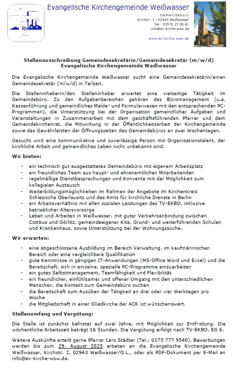 Gemeindesekretärin / Gemeindesekretär (m/w/d) gesucht - bewerben Sie sich bis zum 29. August